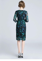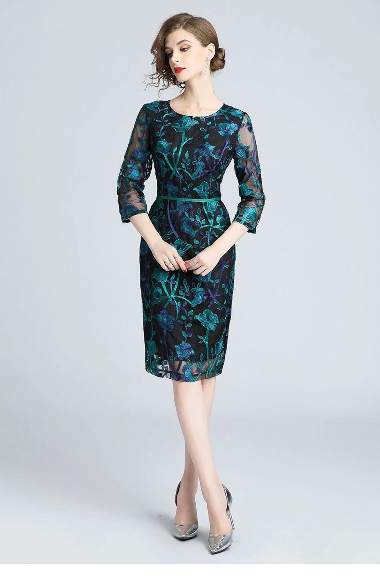 花柄刺繍ワンピース シースルー フラワー 結婚式 タイト パーティー ドレス ロング 大きいサイズ ブラック 黒 ブラック 青 ブルー 七分袖 ひざ丈 | 韓国アパレル 通販サイト ネットショップ amour