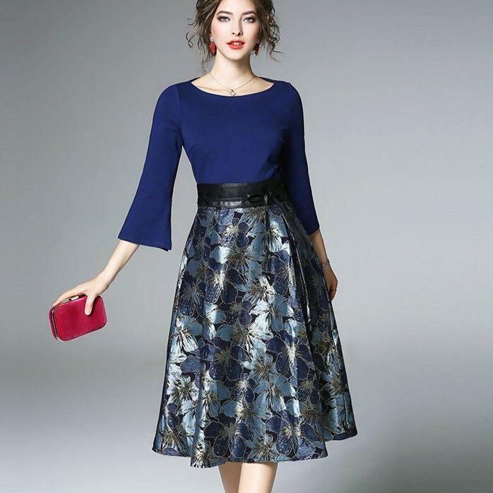ジャガード織花柄ワンピース フレアスリーブ フラワー 切り替えワンピース 結婚式 同窓会 お呼ばれ ドレス 大きいサイズ 青 ブルー ネイビー きれいめ | 韓国アパレル 通販サイト ネットショップ amour