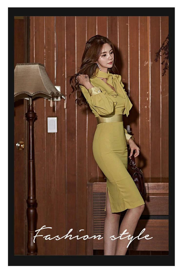 リボン タイトワンピース ボディコンワンピース ペンシルワンピ―ス 秋冬 リボン 結婚式 パーティー ドレス 大きいサイズ イエロー 黄色 長袖 | 韓国アパレル 通販サイト ネットショップ amour