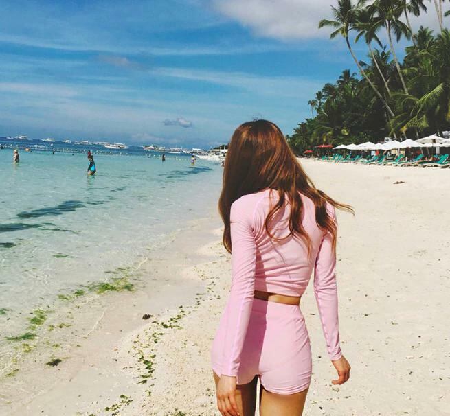 水着 ラッシュガード 2点セット ハイウエストパンツ 長袖トップス 体型カバー 海水浴 海 水泳 サーフィン スポーツ セクシー フェミニン 着痩せ 黒 ピンク | 韓国アパレル 通販サイト ネットショップ amour