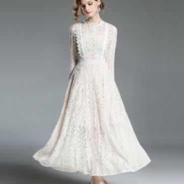 ステッチレースドレス 長袖 フレア Aライン 大人可愛い 上品 エレガント マキシ丈 結婚式 女子会 お呼ばれ パーティードレス ロング 大きいサイズ ベージュ | 韓国アパレル 通販サイト ネットショップ amour